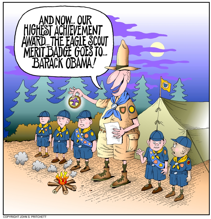 In this parody cartoon, Obama also wins the Eagle Scout Merit Badge!