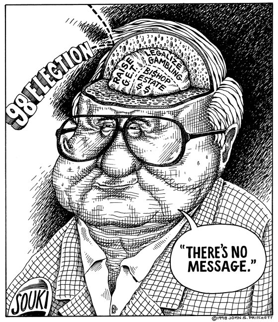 Honolulu Weekly 11-18-98 House member Joe Souki says there's no message from voters in 1998 election. Next Cartoon | Previous Cartoon | 1998 | Archives | Home | Search