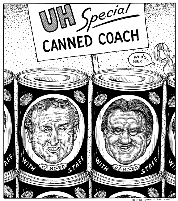 Honolulu Weekly 12-2-98 University of Hawaii Special - Canned Football Coaches, Wagner then von Appen. Next Cartoon | Previous Cartoon | 1998 | Archives | Home | Search