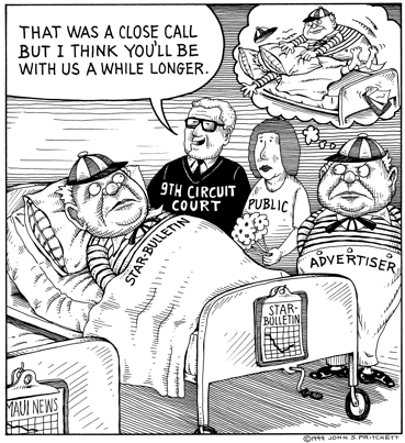 Honolulu Weekly 10-27-99 Gannett's Honolulu Advertiser tries to kill former JOA partner, but Bulletin is saved by courts. Next Cartoon | Previous Cartoon | 1999 | Archives | Home | Search