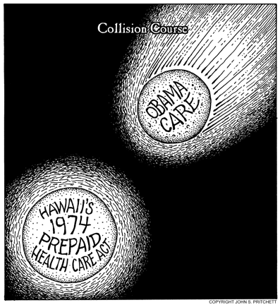 Honolulu Weekly 10-6-10ObamaCare on collision course with Hawaii's 1974 Prepaid Health Care Act. Next Cartoon | Previous Cartoon | 2010 | Archives | Home | Search