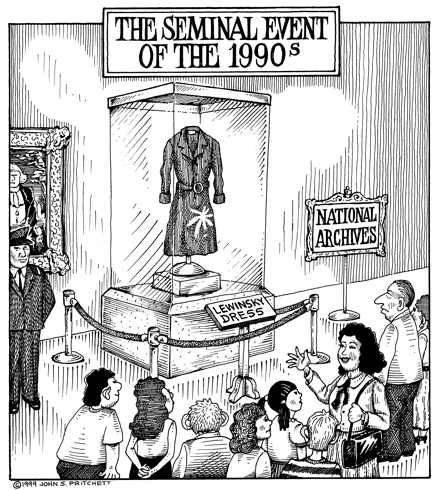 Honolulu Weekly 3-10-99 Monica Lewinsky's semen stained dress in National Archives, seminal event of 1990s Next Cartoon | Previous Cartoon | 1999 | Archives | Home | Search