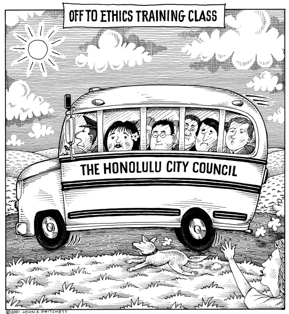 Honolulu Weekly 4-4-01 Members of Honolulu City Council off to Ethics Training Class. | See it in Color Next Cartoon | Previous Cartoon | 2001 | Archives | Home | Search