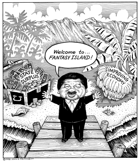 Honolulu Weekly 10-21-98 Ben Cayetano claims bad island economy has turned into Fantasy Island overnight. Next Cartoon | Previous Cartoon | 1998 | Archives | Home | Search