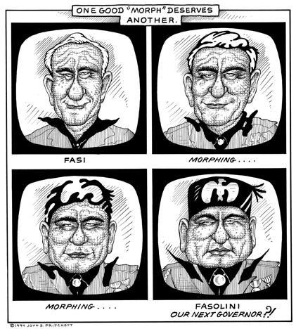 Honolulu Weekly 10-26-94 Fasi's morph, smear commercial inspires a morph of Fasi cartoon. Next Cartoon | Previous Cartoon | 1994 | Archives | Home | Search