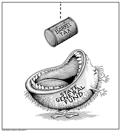 Honolulu Weekly 4-21-10 Barrel tax gobbled up by insatiable state general fund Next Cartoon | Previous Cartoon | 2010 | Archives | Home | Search