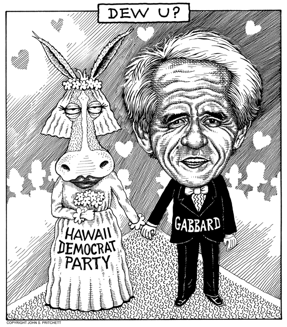 Honolulu Weekly 9-12-07 Republican Mike Gabbard switches parties, weds Democrat donkey. Next Cartoon | Previous Cartoon | 2007 | Archives | Home | Search