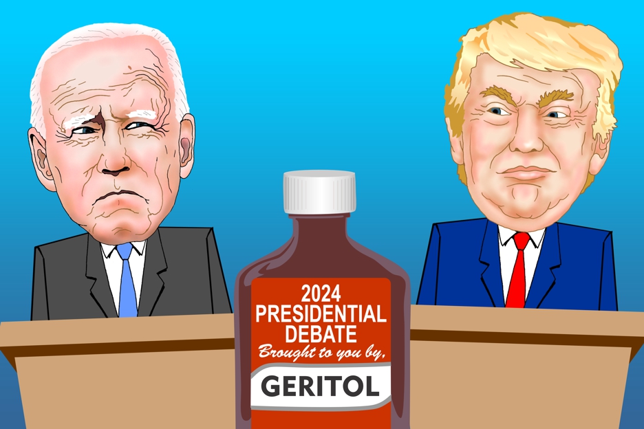 Joe Biden, Donald Trump debate cartoon, 2024 presidential debate brought to you by, Geritol.