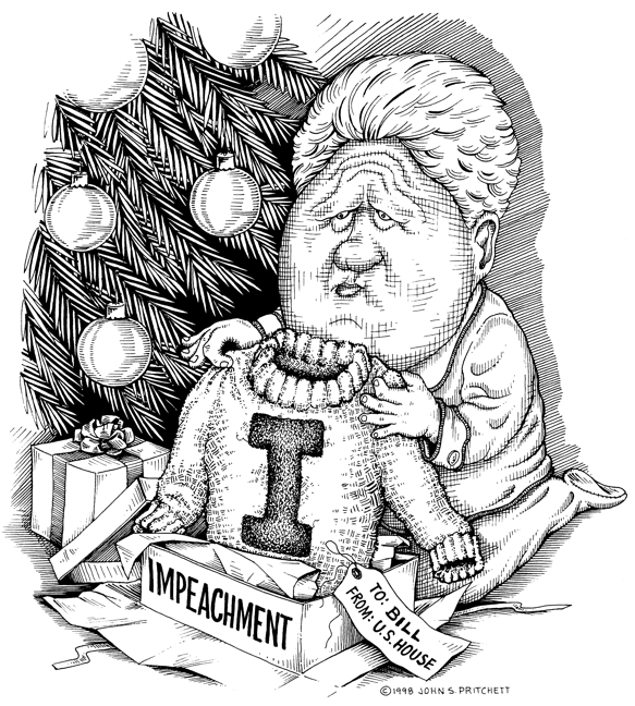 Honolulu Weekly 12-16-98 Just what he always wanted - Bill Clinton impeached by House of Representatives. Next Cartoon | Previous Cartoon | 1998 | Archives | Home | Search