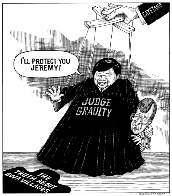| The biggest theft of city money in Honolulu history took place under Jeremy's watch. Former city housing official Michael Kahapea was accused of stealing almost $6 million in the Ewa Villages scandal. Newly appointed Circuit Court Judge Rey Graulty somehow wound up with the case and denied the defense any opportunity to question Harris. Graulty had just been appointed judge by Governor Ben Cayetano and remember, Ben, with the help of Dan Inouye, cut a deal with Harris not to run against him in the '98 Democratic primary. And so, Graulty shielded Jeremy from the scandal. Judge Graulty did allow the defense to question Francis Kaahaaina, the man who threatened to "bring the mayor down with me" if charged in the case. But Kaahaaina could not be found and never testified. Honolulu Weekly cartoon 7-19-2000 |