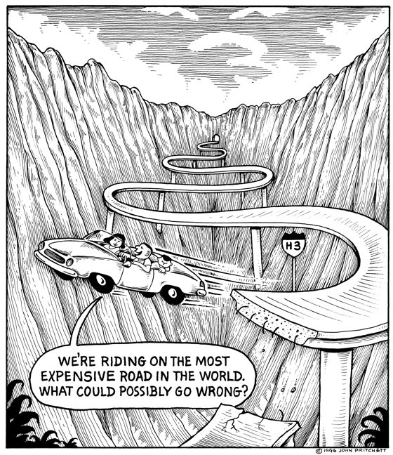 Honolulu Weekly 8-7-96 The H-3 Freeway, the most expensive road on earth Next Cartoon | Previous Cartoon | 1996 | Archives | Home | Search