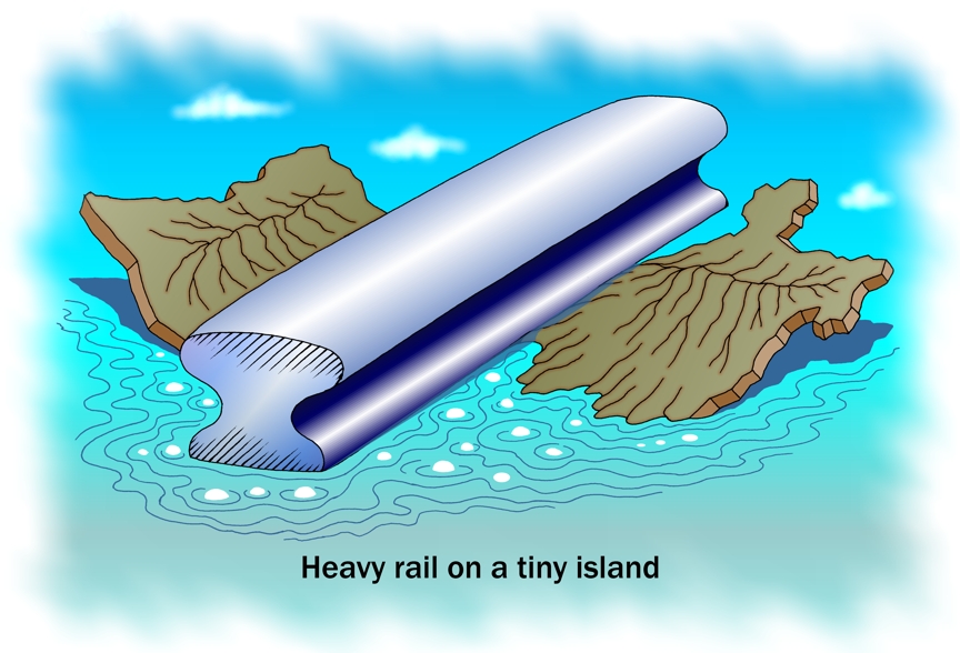 Hawaii Reporter 12-10-10 Proposed heavy rail is wrong for tiny island of Oahu, Hawaii. Next Cartoon | Previous Cartoon | Pritchett's Pen Archive | Home | Search