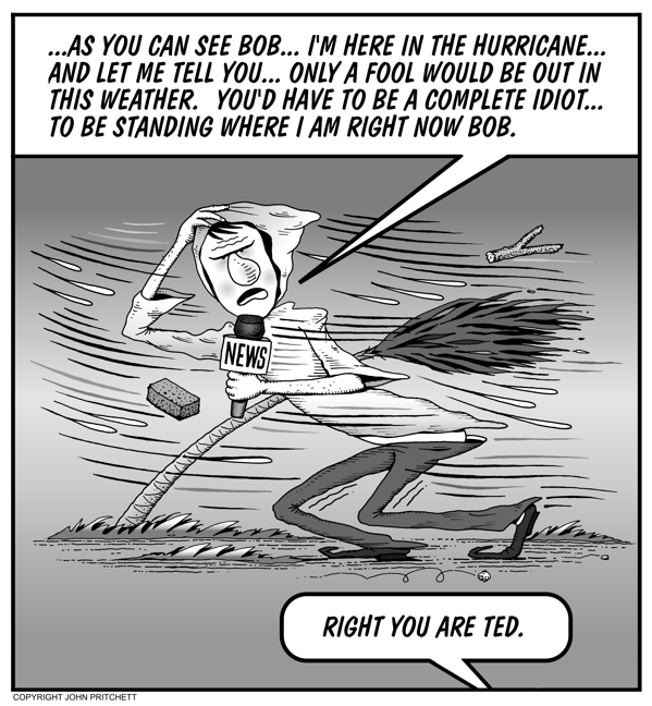 Honolulu Weekly 10-26-05 TV news reporter covers hurricane | See it in Color Next Cartoon | Previous Cartoon | 2005 | Archives | Home | Search