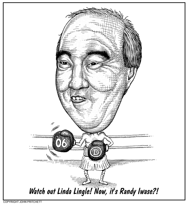 Honolulu Weekly 1-11-06 Randall Iwase threatens to challenge Hawaii Governor Linda Lingle in 2006 election. Next Cartoon | Previous Cartoon | 2006 | Archives | Home | Search