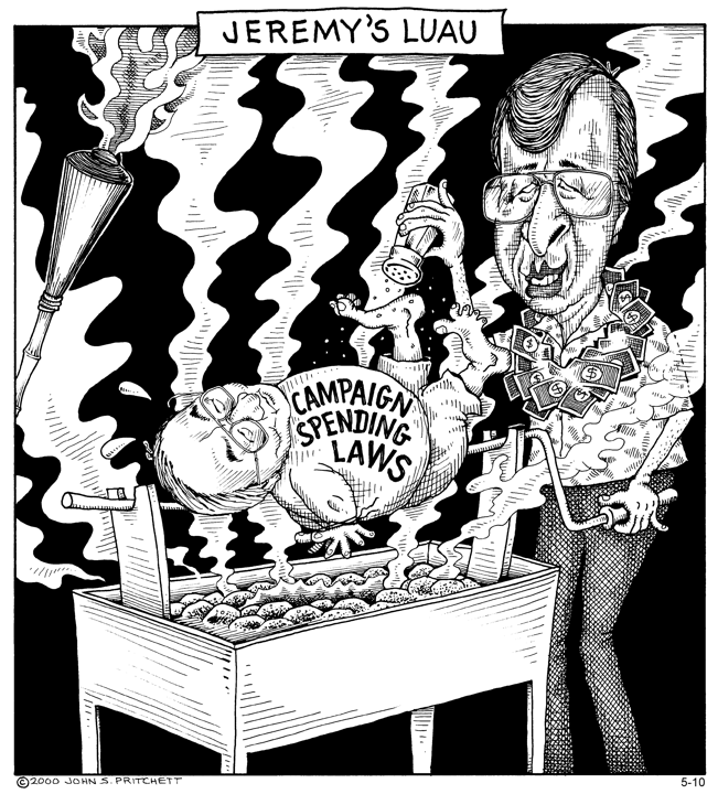 | The city spent $13.6 million on buses for the new Country Express route out in Waianae. The buses were purchased from a Canadian company, New Flyer Industries. To kick off the new service, the city threw a big luau at Waianae District Park and requested that New Flyer pick up the $9,000 tab for the food. There were accusations that Jeremy used the event and city money as part of his re-election campaign and that the $9,000 "donation" from New Flyer was illegal. According to Bob Watada, director of the Campaign Spending Commission, "Jeremy is a master at skirting the campaign spending laws." The luau was the first of many such events all scheduled before the election. Honolulu Weekly cartoon 5-10-2000 |