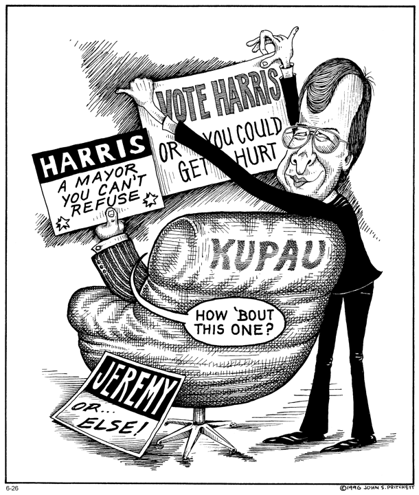 | Walter Kupau was the very colorful, Don Corleone-like leader of the Hawaii Carpenters Union, the state's largest union. Kupau knew he could count on Jeremy to deliver those make-work city construction contracts, and Jeremy could use the union endorsement. It was rumored that Kupau might even jump into the campaign. Or, at least provide a few campaign slogans. Honolulu Weekly 6-28-1996 |