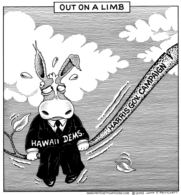 Honolulu Weekly 1-30-02 Hawaii Democrats out on a limb after Harris drops out of Gov's race. Next Cartoon | Previous Cartoon | 2002 | Archives | Home | Search