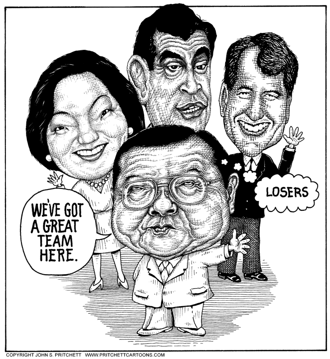 Honolulu Weekly 8-21-02 Senator Dan Inouye asses Democratic candidates. Next Cartoon | Previous Cartoon | 2002 | Archives | Home | Search