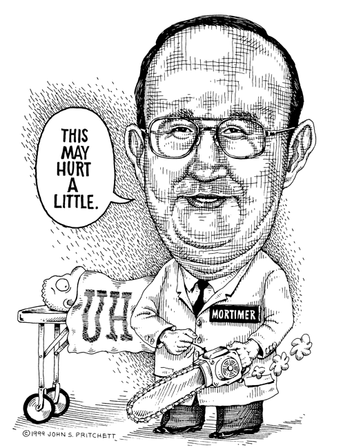 Honolulu Weekly 9-15-99 University of Hawaii President Kenneth Mortimer cuts UH budget with chainsaw Next Cartoon | Previous Cartoon | 1999 | Archives | Home | Search