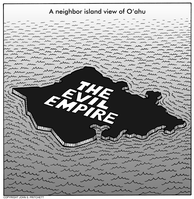 Honolulu Weekly 9-19-07 Hawaii's neighbor islanders view Oahu as evil empire. Next Cartoon | Previous Cartoon | 2007 | Archives | Home | Search