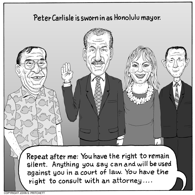 Honolulu Weekly 9-29-10 City Prosecutor Peter Carlisle is sworn in as new Honolulu mayor. Next Cartoon | Previous Cartoon | 2010 | Archives | Home | Search