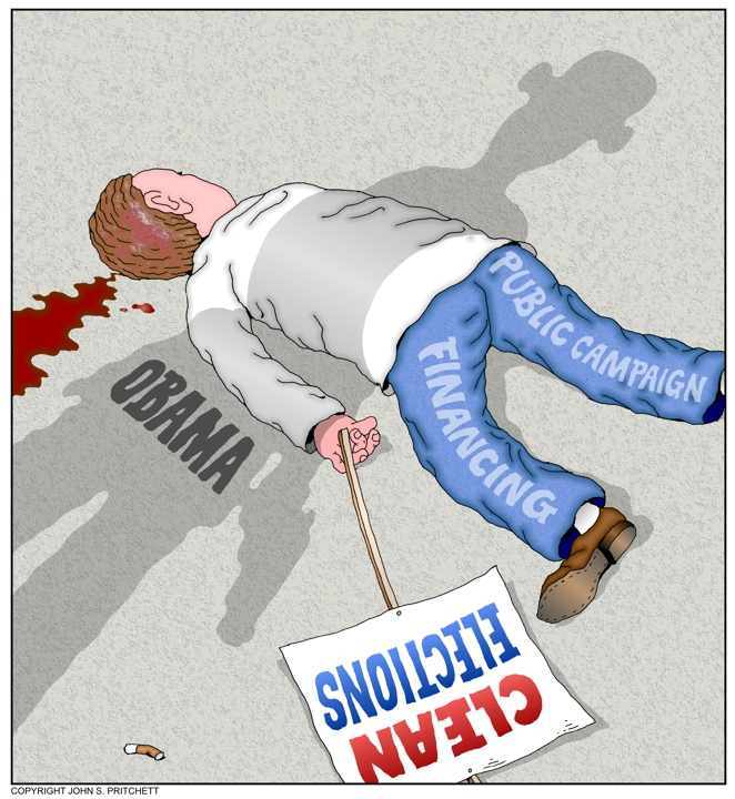 Barack Obama breaks promise and opts out of public campaign financing, essentially killing public campagin financing forever.