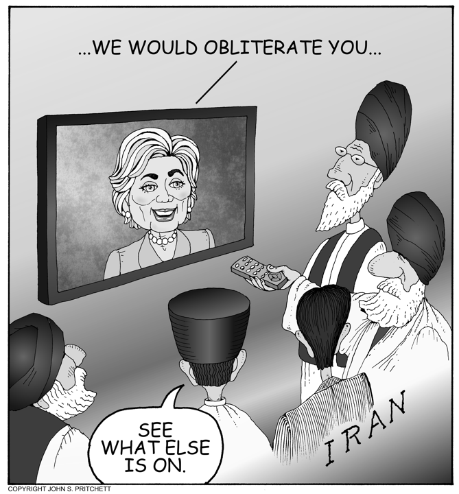 Honolulu Weekly 5-7-08 Hillary Clinton threatens to obliterate Iran if Iran attacks Israel. Next Cartoon | Previous Cartoon | 2008 | Archives | Home | Search