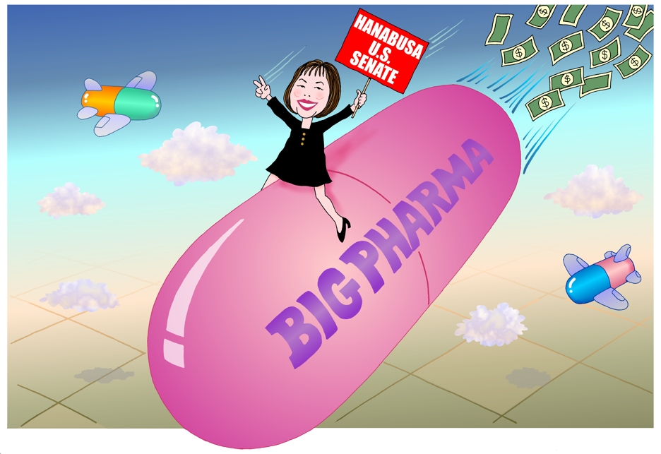 U.S. Senate candidate Hanabusa and Big Pharma Pritchett Cartoon for Honolulu Civil Beat, August 1, 2013 | To comment, Email Pritchett Next Cartoon | Previous Cartoon | Civil Beat Pritchett Cartoon Archives | Home Page
