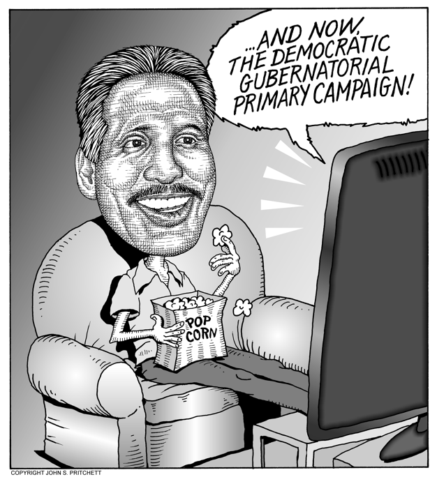 Honolulu Weekly 7-21-10 Republican candidate for governor Duke Aiona watches the Democrat primary campaign chaos. Next Cartoon | Previous Cartoon | 2010 | Archives | Home | Search