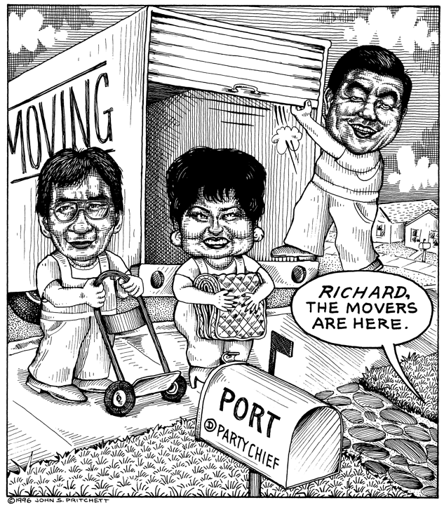 Honolulu Weekly 7-17-96 Richard Port moves out as chairman of Hawaii Democratic Party, Holt, Ikeda, Mizuguchi help. Next Cartoon | Previous Cartoon | 1996 | Archives | Home | Search