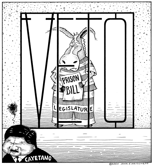 Honolulu Weekly 5-17-00 Governor Ben Cayetano vetos prison bill in disgust citing union problems. Next Cartoon | Previous Cartoon | 2000 | Archives | Home | Search