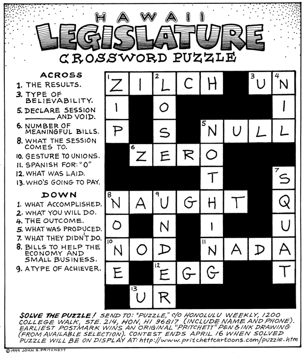 Honolulu Weekly 4-14-99 Solved Hawaii Legislative Outcome Crossword Puzzle Next Cartoon | Previous Cartoon | 1999 | Archives | Home | Search