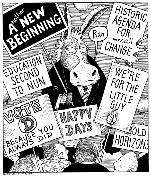 Honolulu Weekly 5-20-98 Hawaii Democrats rally around the same old, worn-out slogans. Next Cartoon | Previous Cartoon | 1998 | Archives | Home | Search