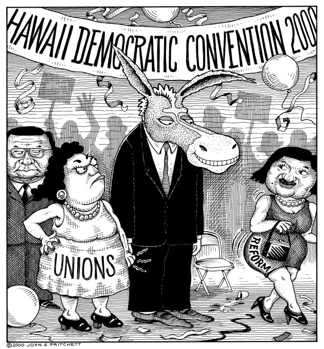 Honolulu Weekly 5-31-00 Ben Cayetano in drag at Hawaii Democrat Convention, entices Dems with reform. Next Cartoon | Previous Cartoon | 2000 | Archives | Home | Search