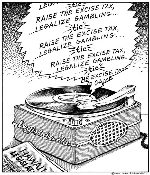 Honolulu Weekly 3-31-99 Hawaii Legislature like a broken record, every year it's raise the excise tax, legalize gambling. Next Cartoon | Previous Cartoon | 1999 | Archives | Home | Search