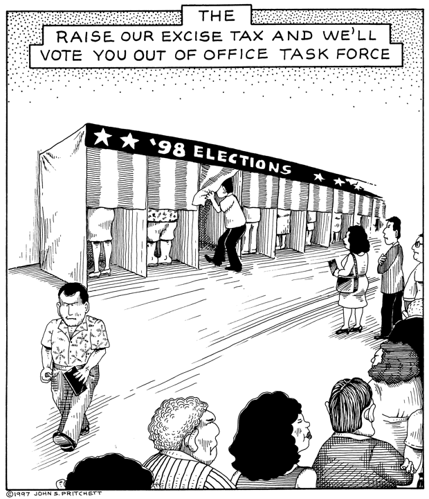 Honolulu Weekly 12-24-97 The raise our excise tax and we'll vote you out of office task force Next Cartoon | Previous Cartoon | 1997 | Archives | Home | Search