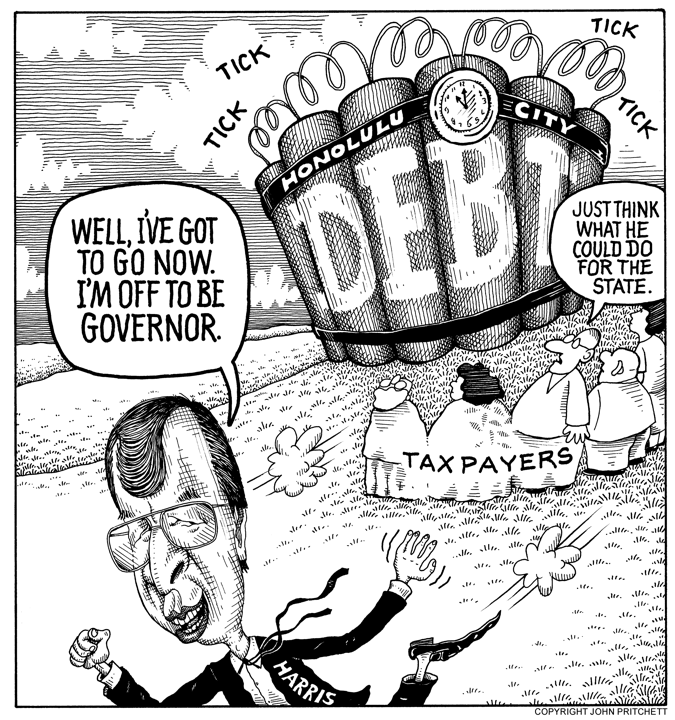 Honolulu Weekly 5-1-02 First place editorial cartoon, 2002 Hawaii Publishers Association Next Cartoon | Previous Cartoon | 2002 | Archives | Home | Search Read the commentary for this cartoon.