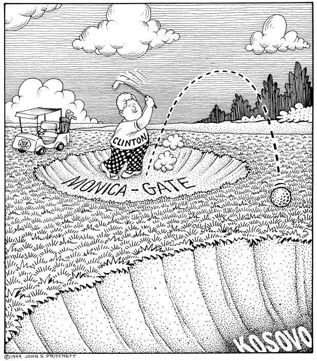Honolulu Weekly 4-7-99 Golfer Bill Clinton goes from Monica Lewinsky sand trap into Kosovo war sand trap. Next Cartoon | Previous Cartoon | 1999 | Archives | Home | Search