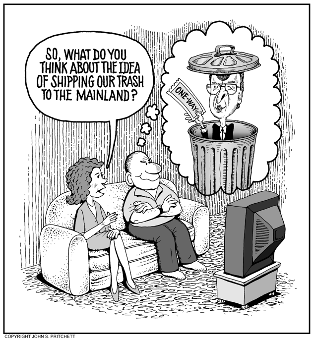 Honolulu Weekly 10-20-04 Hawaii to ship trash to the mainland.Next Cartoon | Previous Cartoon | 2004 | Archives | Home | Search