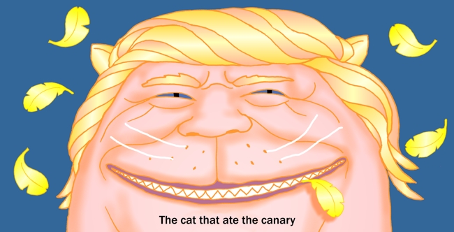 Donald Trump is the cat that ate the canary. Pritchett Cartoon for MidWeek, November 16, 2016 | To comment, Email Pritchett Next Cartoon | Previous Cartoon | MidWeek Pritchett Cartoon Archive | Home Page | Search
