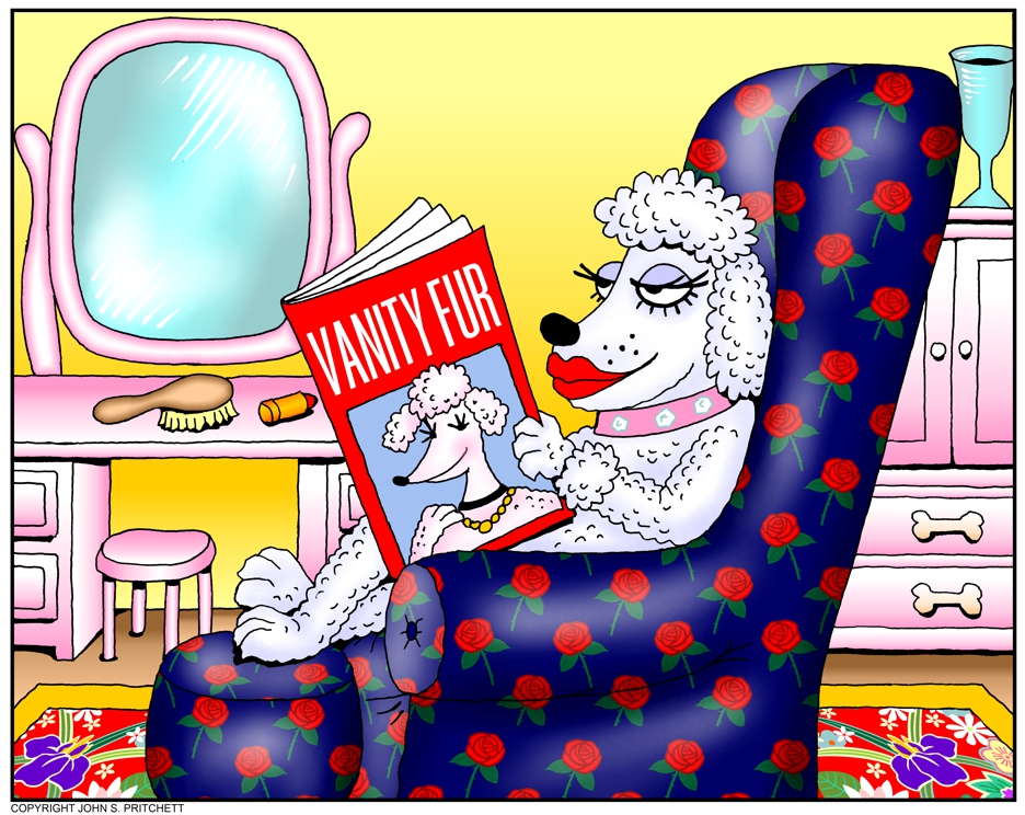 Dog reads Vanity Fur magazine. For details on usage or to purchase original artwork: Email Pritchett Dog Cartoons | Crazy Cartoons | Site Map | Home Page