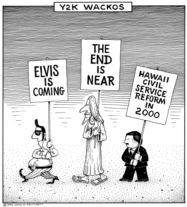 Honolulu Weekly 12-29-99 Hawaii Governor Ben Cayetano joins Y2k wackos with push for civil service reform in 2000. Next Cartoon | Previous Cartoon | 1999 | Archives | Home | Search