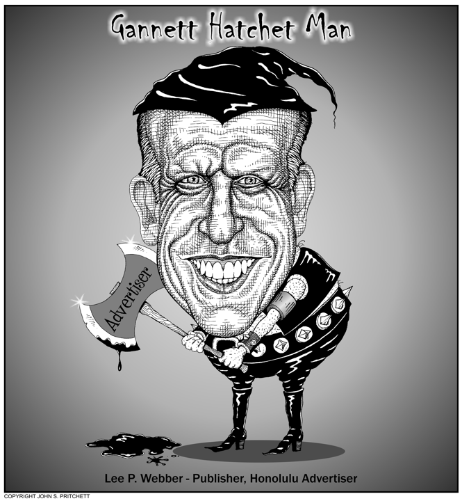 Honolulu Weekly 7-23-08 Honolulu Advertiser Publisher Lee P. Webber, Hatchet Man for Gannett. | See it in Color Next Cartoon | Previous Cartoon | 2008 | Archives | Home | Search