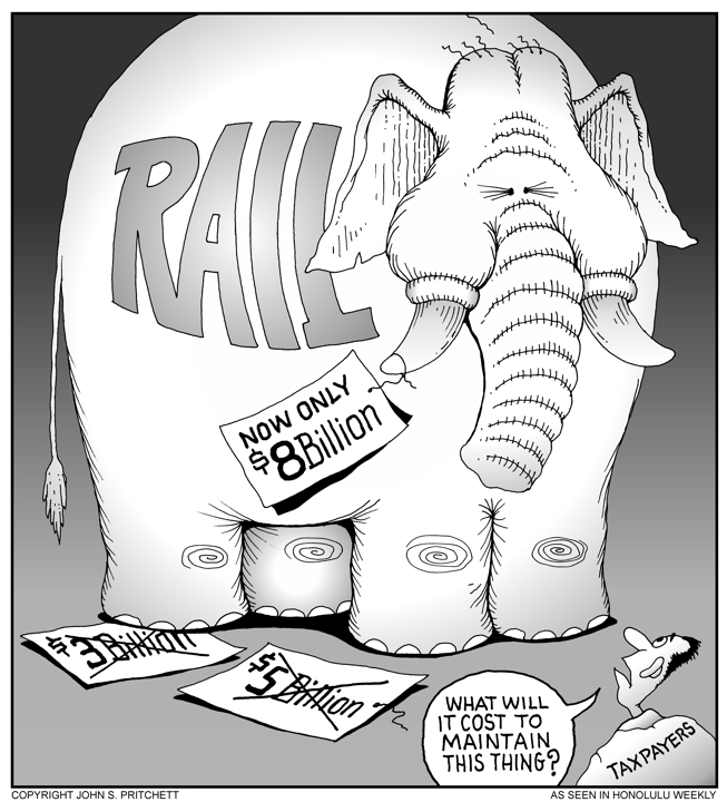 Honolulu Weekly 12-8-10 The price tag for rail gets higher and higher, maintenance cost unknown. Next Cartoon | Previous Cartoon | 2010 | Archives | Home | Search